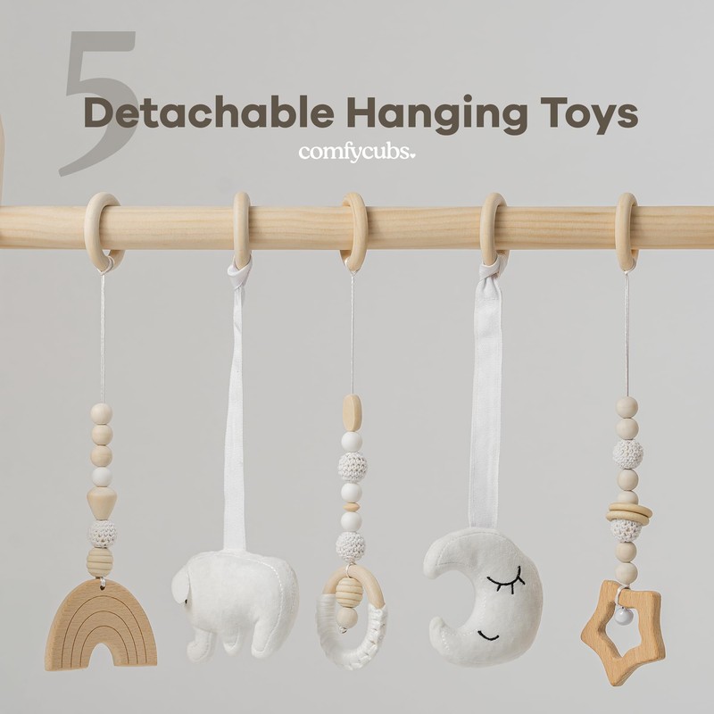 - Montessori Play Gym for Toddlers: Comfy Cubs wooden baby gym includes 5 adorable hanging toys in white and wood tones, designed to stimulate your baby's visual and tactile senses. Helps develop hand-eye coordination and strengthens fine motor skills from an early age.
