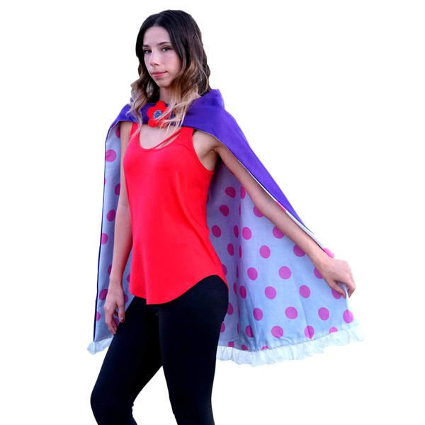 - REDESIGNED FOR 2022: Purple exterior, white and pink polka dot lining, and beautiful ornate white flower trip on the bottom of the cape. Velcro strap for perfect fit around the neck with a beautiful flower in front. Retails for $49.99.