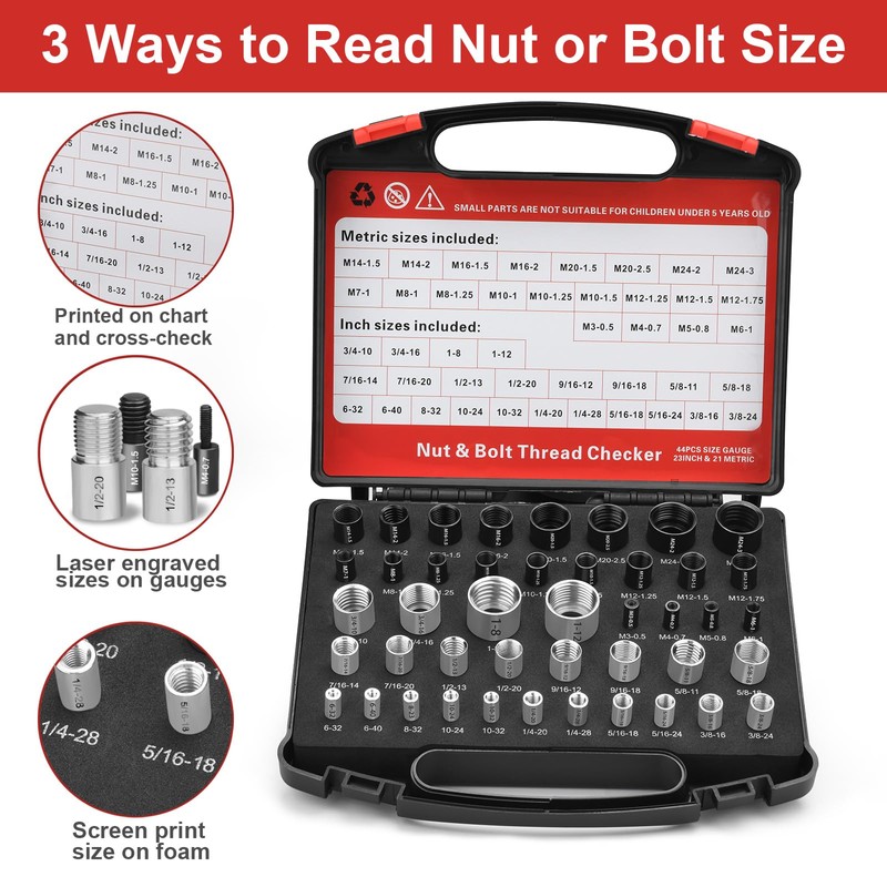 - Efficient Identification, Time Saving Tool: Easily screw a nut or bolt onto a thread gauge and accurately check the size in seconds. With the standard and metric thread checker, you can quickly verify the size of nuts and bolts to replace damaged, loose, rusty old parts in your home or garage. Say goodbye to Guess size checks at the hardware store and increase your productivity. This bolt sizing and thread gauge kit is a great assistant for repairmen, mechanics and contractors, and is ideal for DIY enthusiasts, suitable for gifting to friends and family