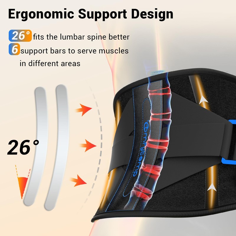 - 【Ergonomic Lumbar Support】Our back support brace is engineered for comfort. This waist belt with 6 built-in support strips(4 lumbar + 2 abdomen)—offering targeted, zoned support and 360°balanced pressure distribution.The 26° arch-shaped bars Fits the natural shape of the human lumbar spine and relieves pressure. The 2.7m extra-long cord is ideal for providing lumbar support while working at your desk or relaxing on the sofa. Please wear the brace correctly and Loosen or tighten to ease pressure when seated