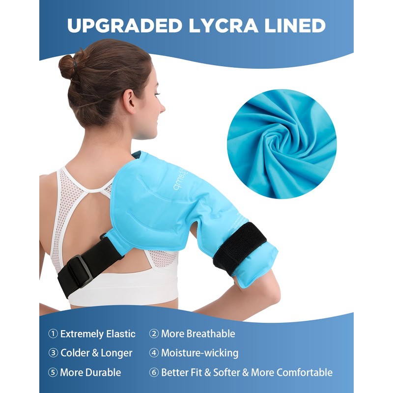 - SHOULDER ICE PACK WRAP: This ice pack is specially designed for the shoulder rotator cuff. Shoulder cold pack wraps around the shoulder, bicep, tricep, arm, and fastens to the upper body with a strong removable and adjustable strap which makes this gel injury ice pack a universal fit for hands-free application and a full range of movement. This mojility ice pack can be used sitting, standing, or lying down, great for home or gym use. (Suitable for chest sizes up to 50")
