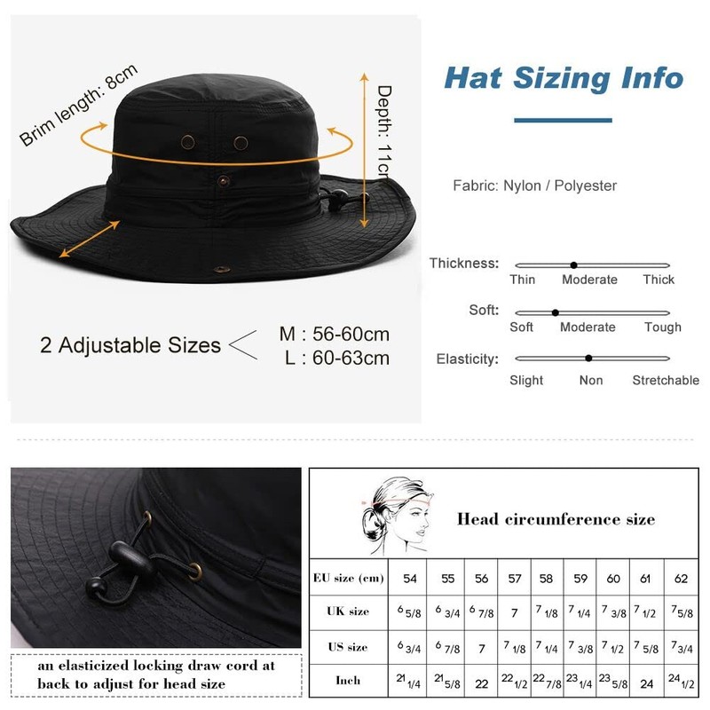 - 【UPF 50+ sun protection】: a hat with a 3 inch wide brim can block 97.5% of the sun's harmful ultraviolet rays. Our fabric has an unbeatable UPF 50+. These boonie hats are perfect for people who are engaged in outdoor activities such as fishing, hunting, camping, hiking and many more activities. With this hat, you can spend more hours in the garden, cut grass while enjoying nature without fear of the sun.