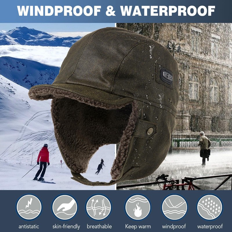 Experience the Ultimate British Winter Protection! Introducing our Waterproof and Windproof Aviator Pilot Hat, specially designed to tackle the chilly and wet British winter. Here's why it's your ideal companion for the season: Born for British Winter: This hat is crafted to excel in the UK's snowy and windy conditions. It's your trusted partner for outdoor work, winter sports like cycling, skiing, snowboarding, camping, hiking, or simply walking your dogs on frosty mornings. Quality & Warm Fleece Lined: Inside, you'll find soft, thick, and durable fleece lining that provides unparalleled comfort and warmth. It's the perfect Christmas or birthday gift for your loved ones. Three Layers of Protection: Our hat boasts a waterproof and windproof exterior, featuring a combination of faux leather, waxed cotton, and waterproof polyester shell. This formidable trio ensures you stay dry and cozy. Versatile Windproof Chin Strap: The ear flaps are not only functional but also versatile. You can fold them up and securely snap them in place for a classic look, or release them down to use as a chin strap, wrapping your face, ears, and neck in snug warmth. Peaked Winter Cap: With a 1.8-inch brim, this cap expertly shields your eyes and glasses from both the sun and snow. It's a practical and stylish addition to your winter wardrobe. Trendy & Unisex: Our waterproof faux leather trapper hat combines style and functionality, making it suitable for gentlemen, ladies, and teenagers alike. It effortlessly complements any winter attire you have. Prepare to conquer the British winter with the perfect hat. Stay dry, warm, and stylish in any outdoor setting. Don't let the cold weather dampen your spirits - order your Waterproof and Windproof Aviator Pilot Hat today!