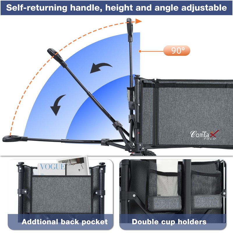 • Automatic Rebound Handle: The handle is adjustable in both height and angle for personalized comfort, and it automatically rebounds to stay upright for safety. This collapsible wagon cart also comes with two cup holders and a side pocket for extra storage