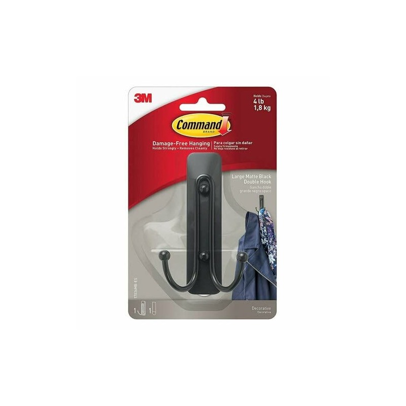 Command Large Wall Hooks, Damage Free Hanging Wall Hooks with Adhesive Strips, No Tools Double Wall Hooks for Hanging Decorations in Living Spaces, 1 Black Colored Hook and 1 Strip