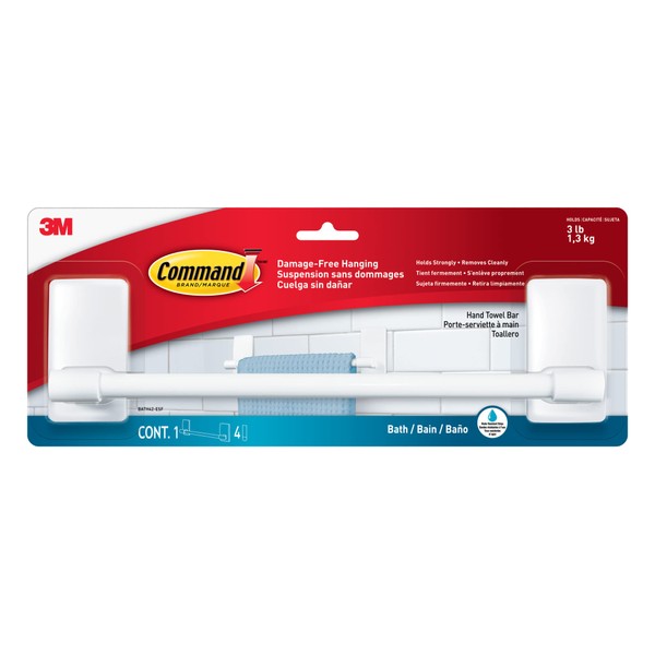 Command BATH42-ESF, Bath Plastic Hand Towel Bar, 1 Hand Towel Bar, 4 Large Water-Resistant Strips White