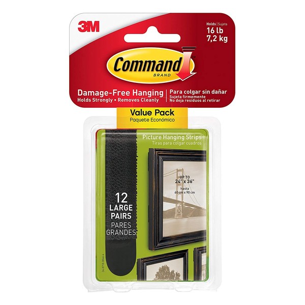 - INCLUDES- 12 Pairs of Large, Black Command Picture Hanging Strips (24 Strips total); 4 Pairs hold 16 lbs. Maximum frame size of 24 inches x 36 inches