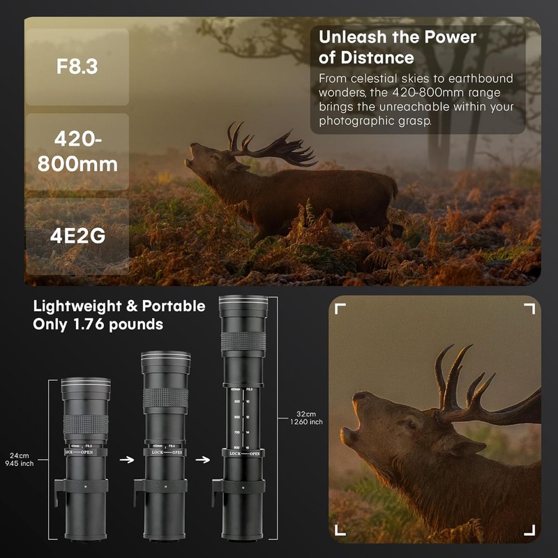 • VERSATILE FEATURES: Explore the versatility of this telephoto zoom lens, offering a focal range of 420-800mm for capturing distant subjects with ease. With a minimum focusing distance of 1.5m (4.92ft), you can capture intricate details even from afar. Additionally, the solid full metal construction ensures durability, while features like adjustable zoom and manual focus enable precise control over your shots.