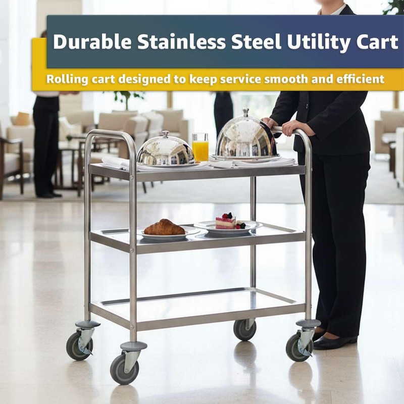 Commercial Stainless Steel Utility Cart 28" x 16" x 32" - 3 Shelf Rolling Metal Cart with Wheels for Kitchen, Hotel, Storage, and Catering - Durable 24 Gauge Light Duty Service Cart for Restaurants