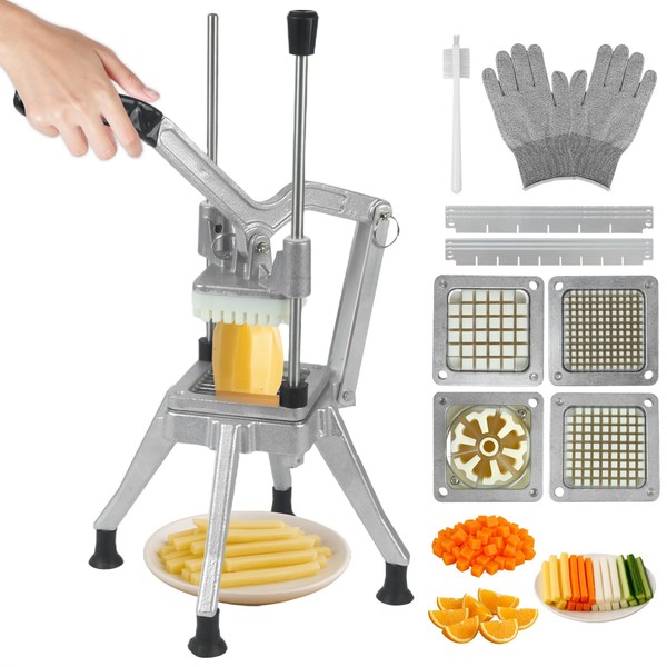 🌈Effortlessly create uniform fries, salad cubes, and fruit wedges with four stainless steel blades (1/2", 3/8", 1/4", 6-wedge).