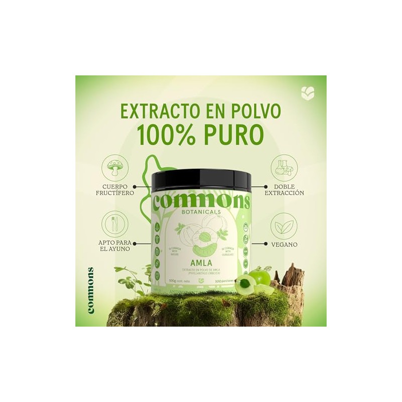 Acerca de este artículo AMLA | Nuestro Extracto Puro de Amla tiene un altísimo contenido de vitamina C, siendo 8 veces más potente que una naranja. Ofrece propiedades antiinflamatorias, antioxidantes y antibacterianas. Además, apoya la visión y es tu aliado para la piel y el cabello. FÁCIL DE TOMAR | Es fácil de incorporar en tu rutina diaria. Añade 1 cucharadita (1 g) a una taza de 250 ml de agua tibia. También puede ser una excelente adición a los tés, lechadas, tónicos, smoothies, panes o repostería. INGREDIENTES ORGÁNICOS | Utilizamos ingredientes 100% naturales y orgánicos, asegurando que cada porción esté libre de aditivos y conservantes, ofreciendo un suplemento puro y saludable. SUMINISTRO | Con 100 gramos de extracto en polvo, tendrás un suministro suficiente para 3 meses, permitiendo una ingesta regular y constante de sus beneficios. COMMONS | Buscamos mejorar la calidad de vida con suplementos naturales que crean armonía y generan bienestar. Ofrecemos las hierbas y adaptógenos más ricos en nutrientes y apoyamos la constante búsqueda innovadora de los mejores extractos, caminando hacia el equilibrio del cuerpo humano.