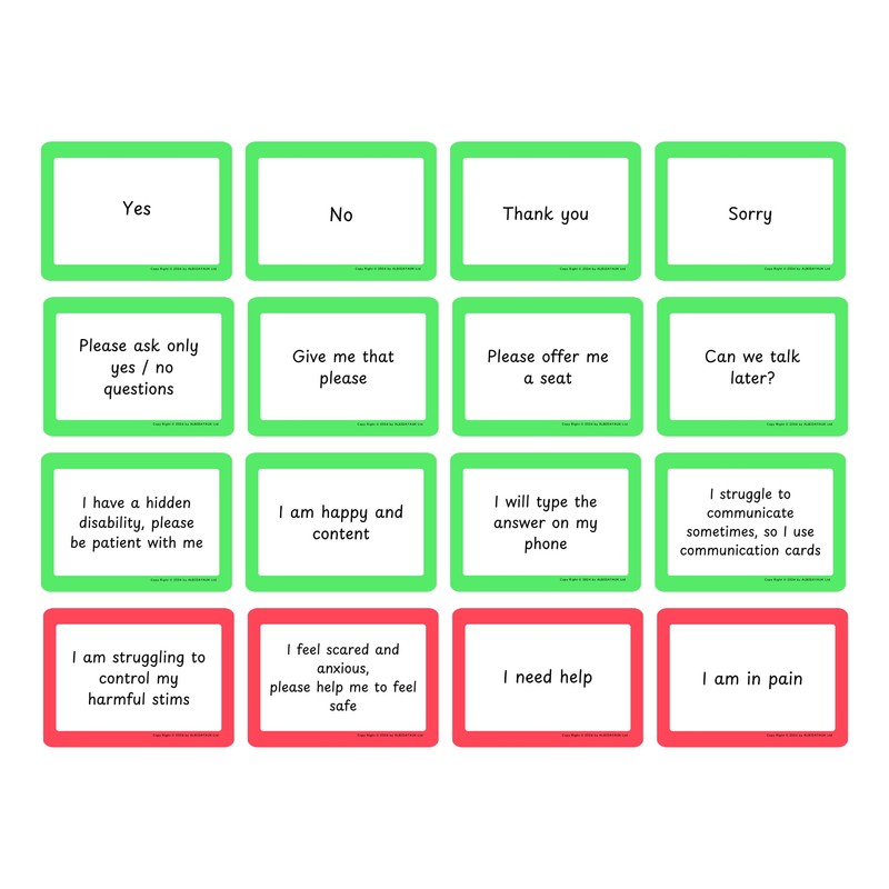 - 25 Double Sided Communication Cards: These cards facilitate clear and concise communication during non-verbal episodes especially for those with ADHD and Autism