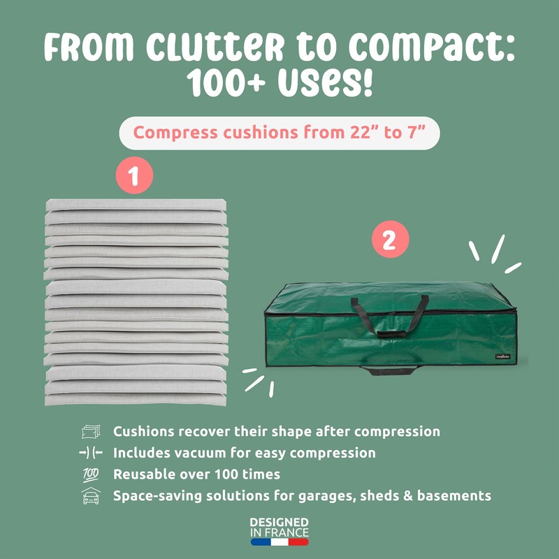 - Long-lasting Compression:Reduce bulky sunbed cushions from 22 inches to a compact 7 inches with our advanced vacuum compression technology. Cushions regain their shape after compression, and the Vacuum Bags are reusable over 100 times. Ideal for storage in garages, sheds, and basements.