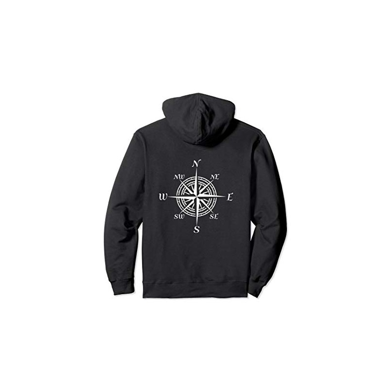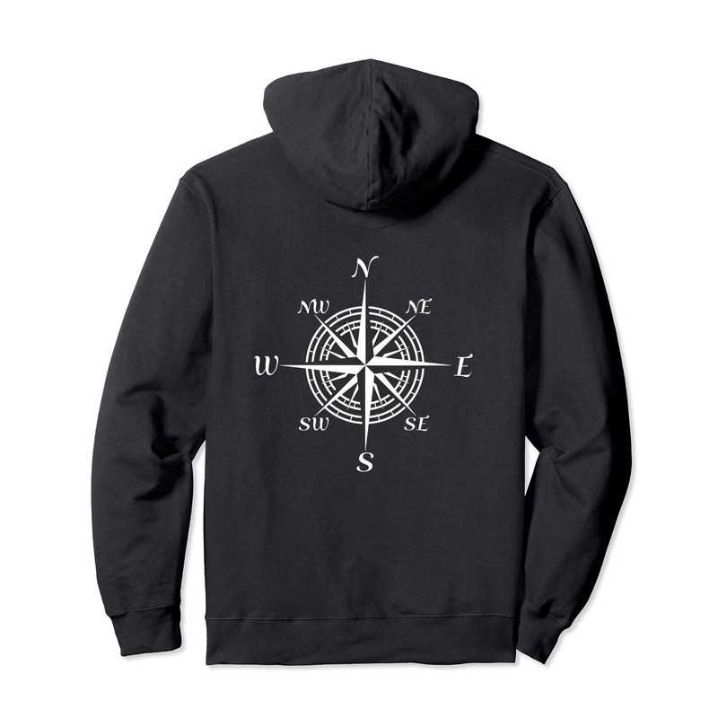 - Nautical boating shirt with a white compass rose showing the eight cardinal directions, North, South, East, West, Northeast, Northwest, Southeast, and Southwest.