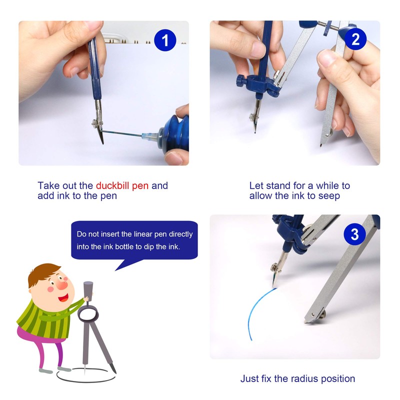 - Extension beam design: an extension beam is attached to the large compass to draw large circles. You can draw larger circles without measuring much and connecting points.