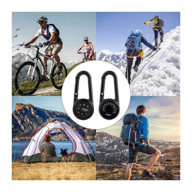 - 3 IN 1 DESIGN It doubles as a compass and carabiner, as well as a thermometer. A sturdy metal carabiner for hanging water bottles, keys, binoculars etc, combined with a compass, waterproof and shockproof, can be used in any weather and can help you navigate in the wilderness