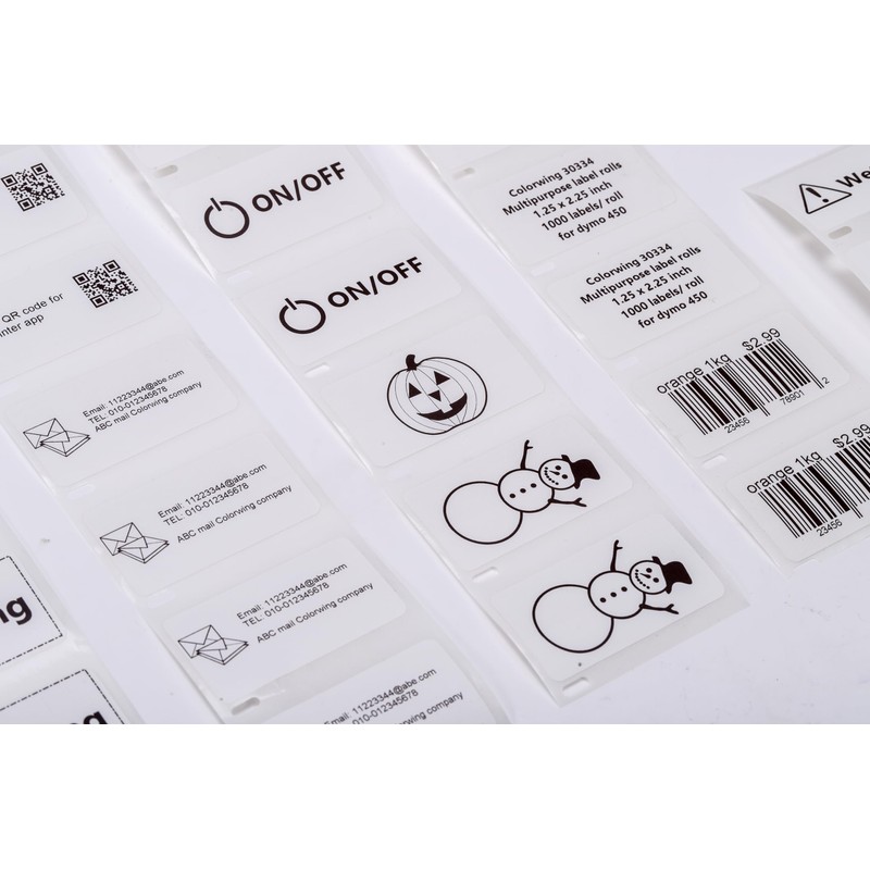 - Quality--These labels will crystal clear print, do not peel off because of strong adhesive, resistant scratches and smudges. Will not become yellow. Every roll label in black poly bag for protection and storage