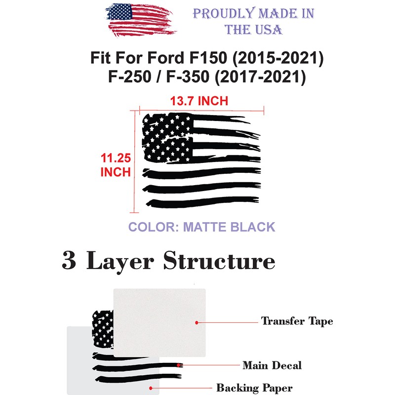Compatible with Ford F150 (2015-2021) | F-250 / F-350 (2017-2021) | Precut American Flag Window Decals Sticker | Rear Middle | Proudly Made in The US | Matte Black (Distressed)