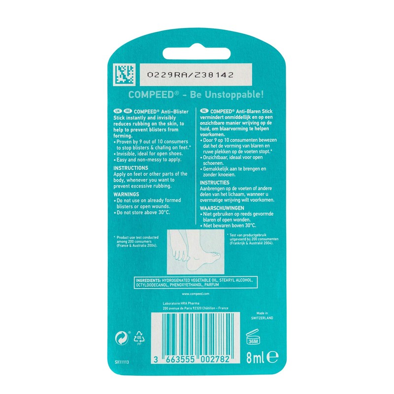 Invisibly helps to prevent blisters and chafing. COMPEED Anti-Blister Stick is effective in the prevention of friction and blistering. Proven by 9 out of 10 consumers to prevent blisters and chafing on feet. Product use test conducted among 200 consumers in France and Australia in 2004