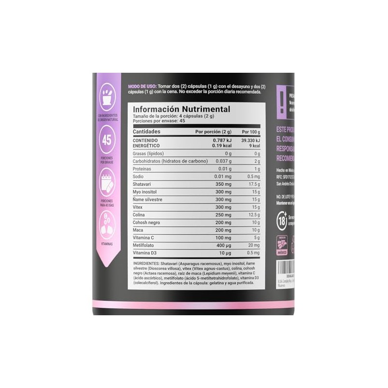 Complejo de Myo Inositol y Shatavari Fertilidad 180 Cpsulas 1000 mg por porcin. Adicionado con ame Silvestre, Maca, Vitex. Ingredientes Naturales.