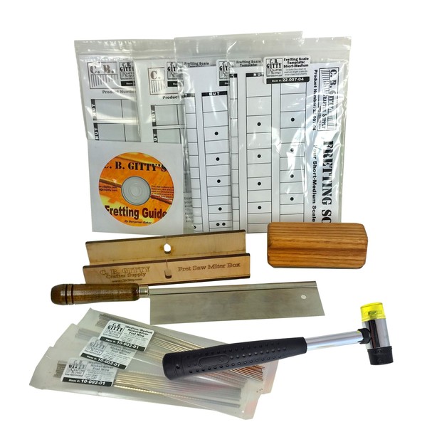 - Contains Fretting Hammer, Saw and Miter Box, Fret Beveling file, 4 prinetd scale templates 18 feet of fret wire & how-to guide,