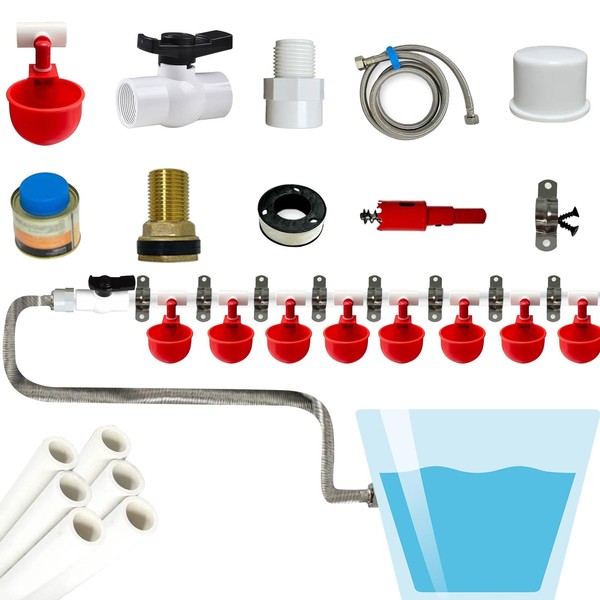Complete Set Pipeline Automatic Chicken Watering System, DIY Chicken Waterer System with PVC Pipe, Stainless Steel Hose, Chicken Water Cup and Float Valve, Easy to Install(No Bucket Included)