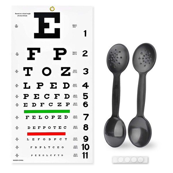 - Complete eye exam kit includes an 11x22 inch Snellen eye chart and 2 pack dual-use eye occluders