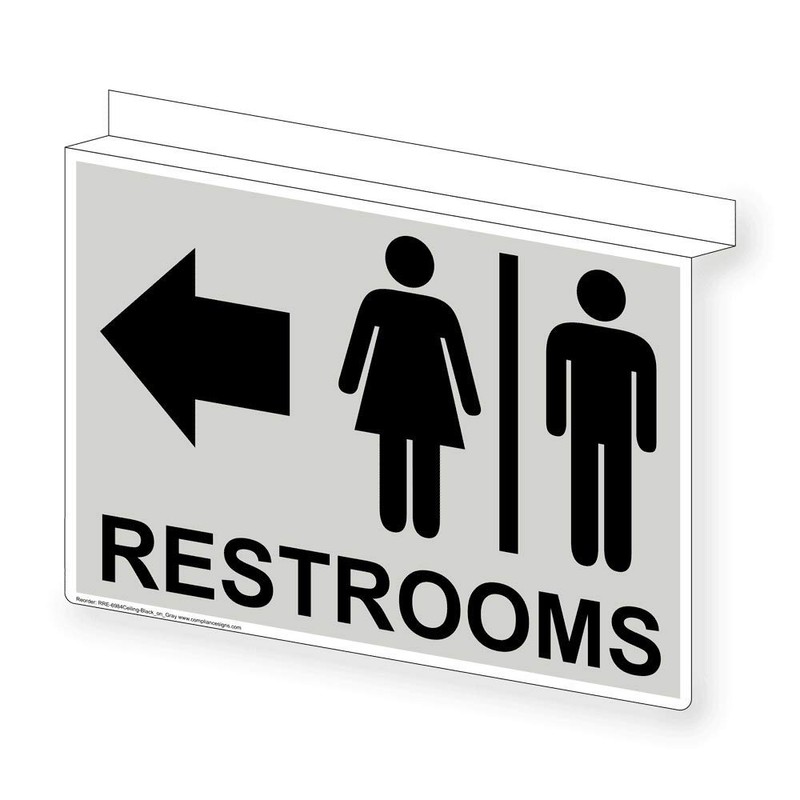 ComplianceSigns.com Restrooms Ceiling Sign, Projection-Mount 14x10 inch Gray Aluminum for Public Bathrooms