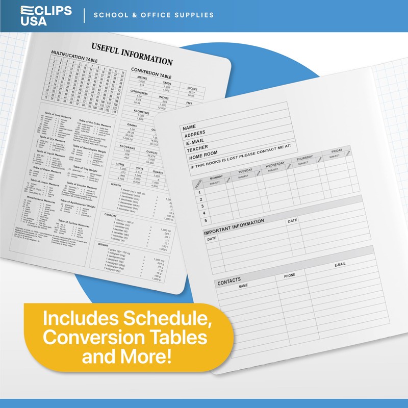 - DIMENSIONS 9.75″ x 7.50″ - Standard weight composition notebooks quad ruled. Inside covers printed with class schedule and math conversion tables.
