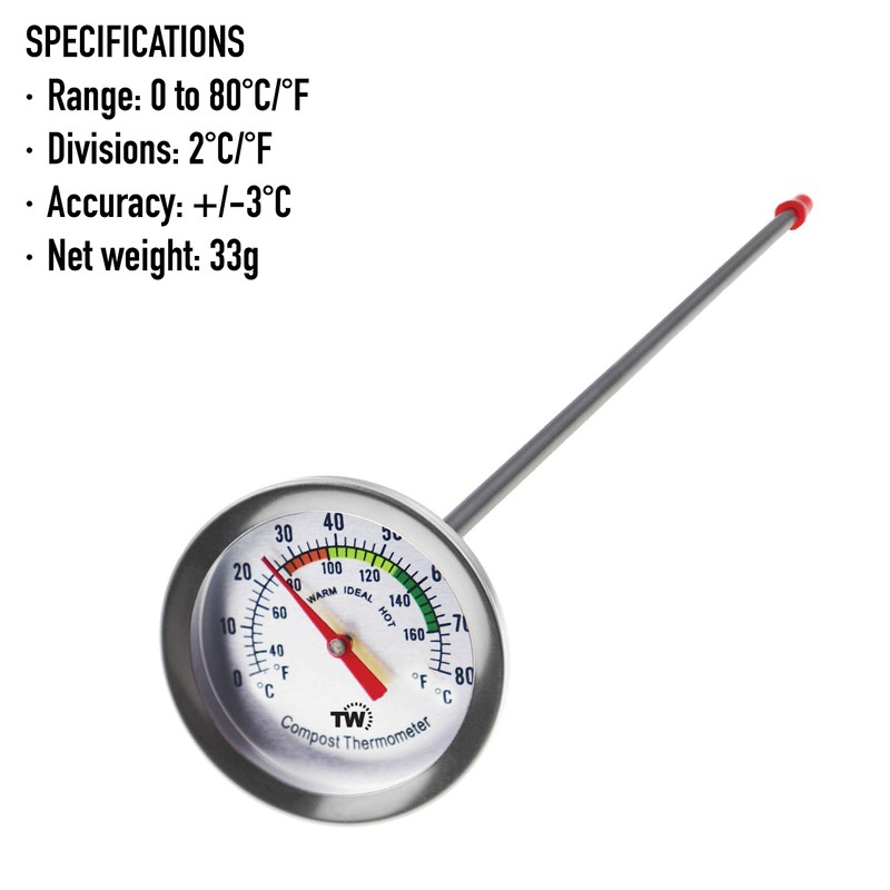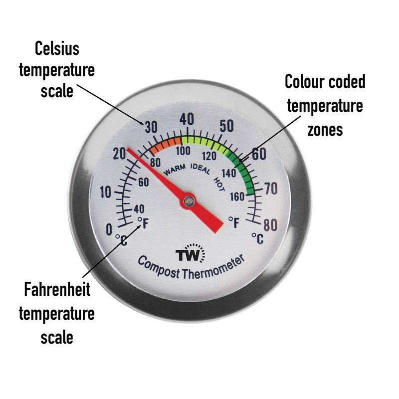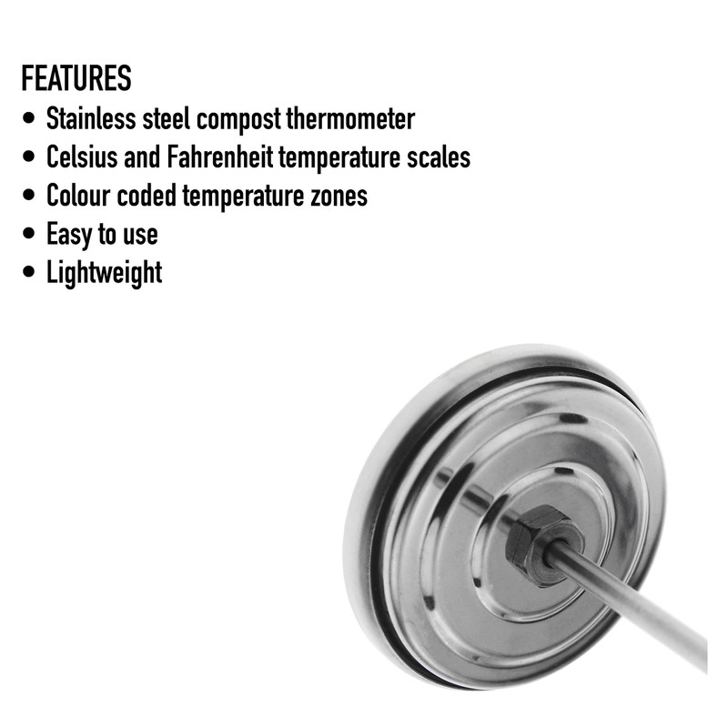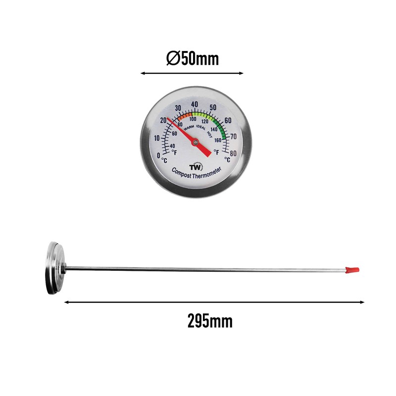 - LARGE COMPOST THERMOMETER - An easy to read compost thermometer with a 295 mm probe length and 50mm dial diameter with recommended temperature zones