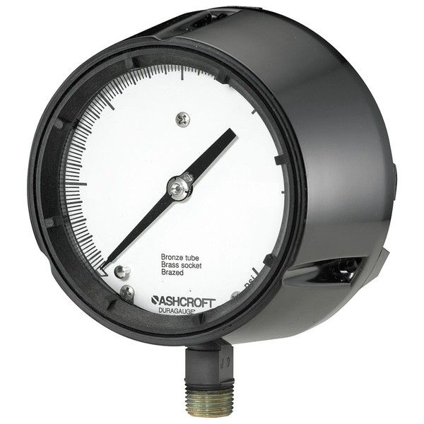 - Price For: Each Dial Size: 4-1/2" Accuracy: +/-0.5% Gauge Type: Process Case Color: Black Connection Location: Lower Connection Size: 1/2" NPT Item: Compound Gauge Lens Material: Glass Smallest Graduation: 5" Hg, 3 psi Ring Material: Threaded Polypropylene Case Material: Phenolic Operating Temp. Range: -50 Degrees to 150 Degrees F Tube Material: Phosphor Bronze