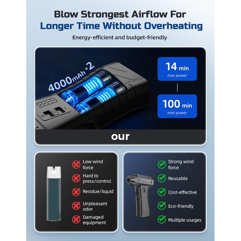 - Fast Charging Air Blow Gun: Powered by two 4000mAh batteries, it offers extended runtime from 15 to 100 minutes. The Type-C fast-charging port ensures quick replenishment, it fully charges only need 2.5H.