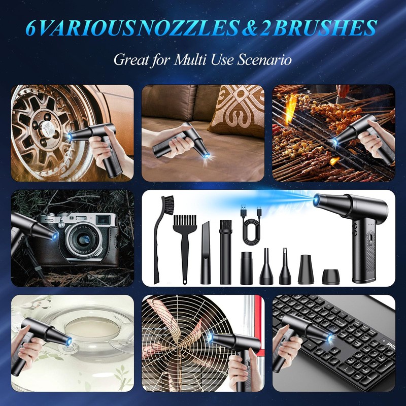 - Multiple Usage Scenarios: Our PC Cleaning kit is equipped with 5 nozzles and 2 brushes, great suitable for many scens, such as keyboard cleaning kit, electric leaf blower, car detailing supplies, pc duster, snow blower, turbo fan, car dryer, air broom, camera cleaner and so on. The diversification nozzles allow you to use for outdoor picnics to blow fires, clean pet hair, inflate swimming rings, yoga balls, air mattresses, etc.