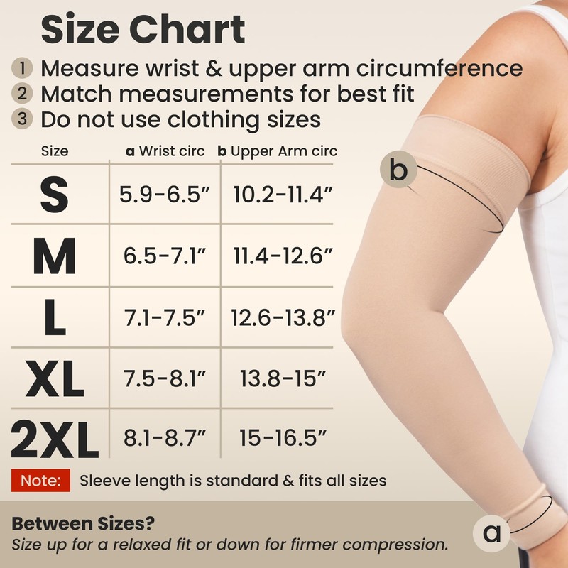 • Size Selection Tip: Refer to our size chart for accurate sizing instead of using clothing or shoe sizes. Prioritize your bicep measurement for the best fit. If your wrist is smaller, choose based on your bicep to ensure proper compression. Between sizes? Go up for a relaxed fit or down for a firmer compression