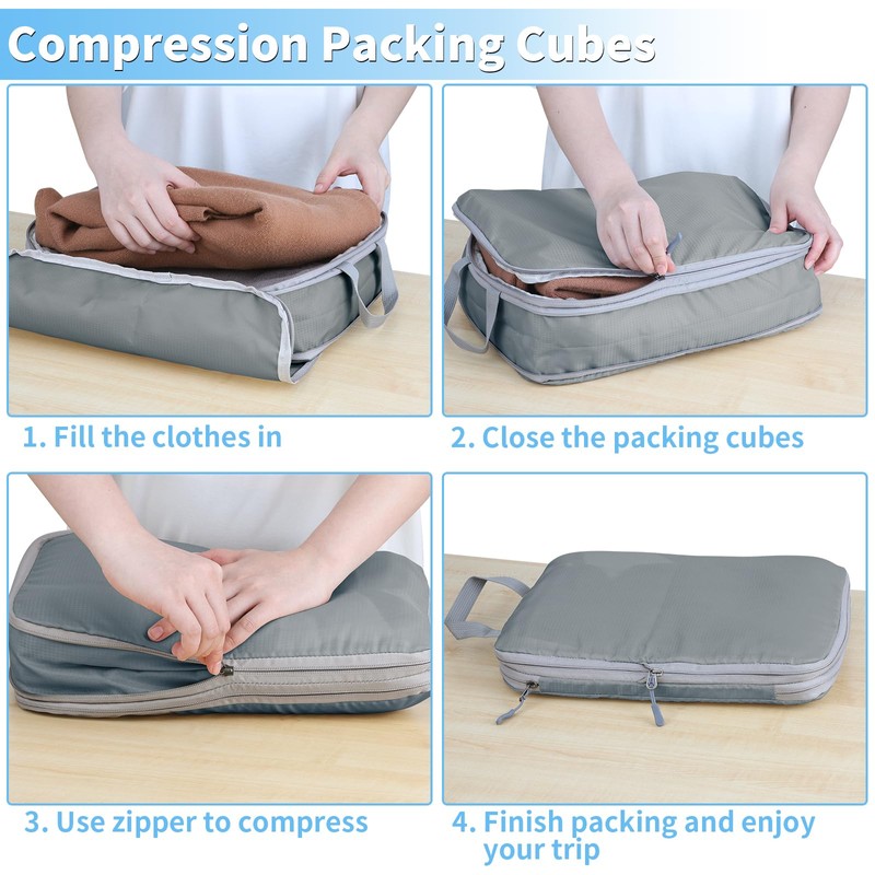 - 【Premium Material & Double Zipper Design】All compression packing cubes are made of High Quality Fabric, lightweight and durable,and come with professionally done seams which do not easily wear & tear with regular uses or compression. Double premium metal zipper design allows your right and left hand to open.