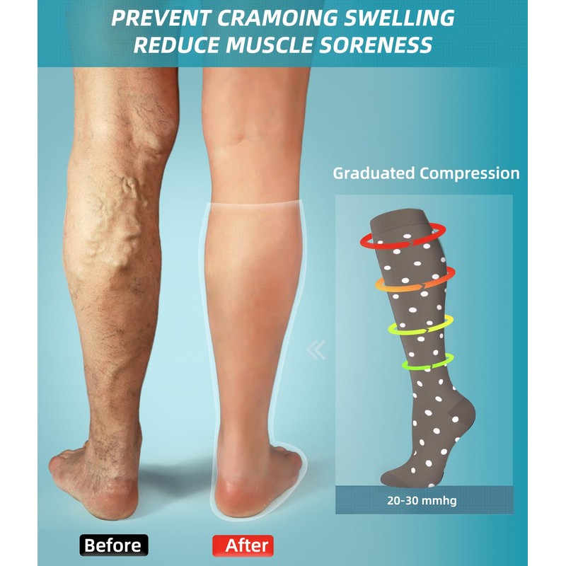 - REDUCE INJURIES - Provide mild squeezing for warmness and enhance blood moving through your legs. Remove stress and stimulate every cell, relieves symptoms varicose veins and excess fluid retention. Help relieve pain & discomfort related to plantar fasciitis, Provides true graduated compression to support your legs, reduce fatigue, soreness, cramping and prevent injuries at the same time.