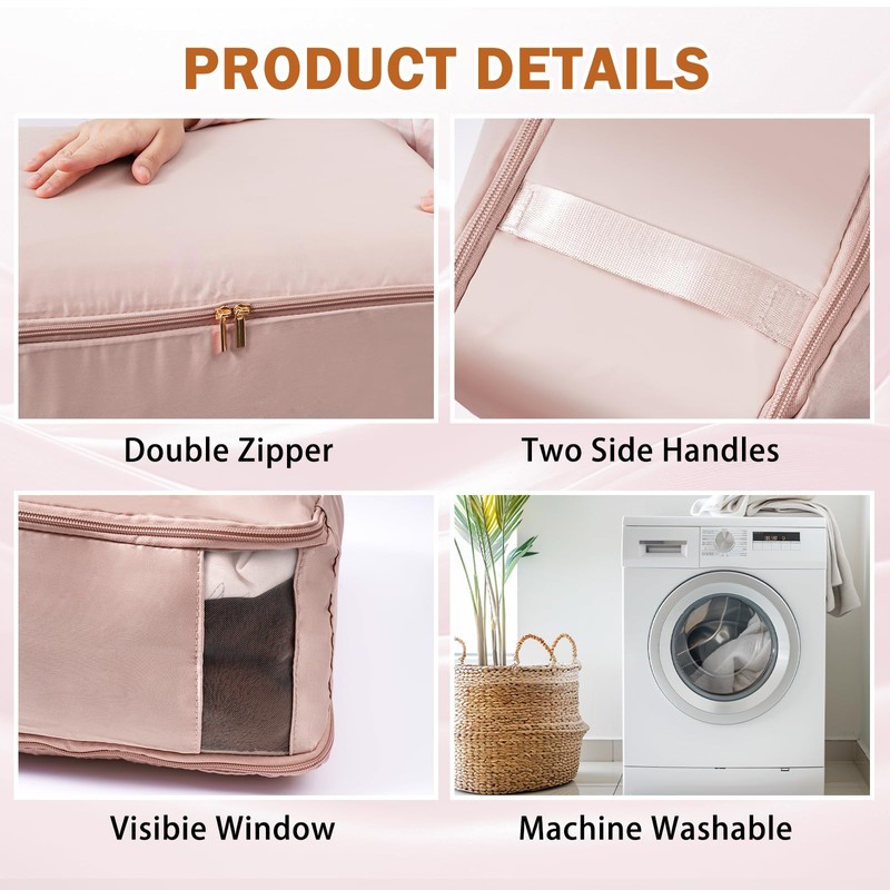• 𝑼𝒍𝒕𝒓𝒂 𝑺𝒑𝒂𝒄𝒆 π‘Ίπ’‚π’—π’Šπ’π’ˆ 𝑺𝒆𝒍𝒇 π‘ͺπ’π’Žπ’‘π’“π’†π’”π’”π’Šπ’π’ π‘Άπ’“π’ˆπ’‚π’π’Šπ’›π’†π’“οΌšEasily compressing up to 40% of space without the need for a vacuum extractor, saving a tremendous amount of extra space in your room. There is a extra zipper outside of the comforter storage bag for storage which can be zipped up to flatten the cubes and save the space as soon as possible.