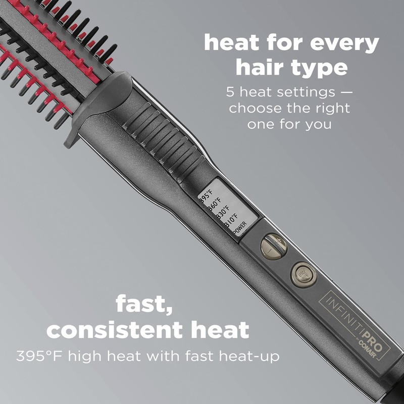 * Nano technology eliminates hot spots and reduces static for healthy-looking hair * Extra-smooth tourmaline ceramic surface for superior performance * Ionic Fusion technology reduces frizz for brilliant shine * 395°F highest heat setting for long-lasting curls and waves * 30-second heat-up * Uniform heat recovery system maintains ultra-high heat levels * 100% styling control, new button design prevents accidental shut-off * 5 precision LED temperature settings with Auto-off * Red bristles heat up, black bristles stay cool * Extra-long professional-length cord