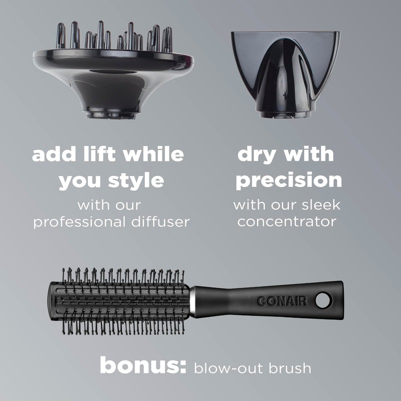 - Includes: Diffuser - boosting volume and adding lift to your style. Concentrator - providing sleek, precise styling. BONUS Blowout Brush - Designed for quick blow-dry styling and professional blowouts at home.