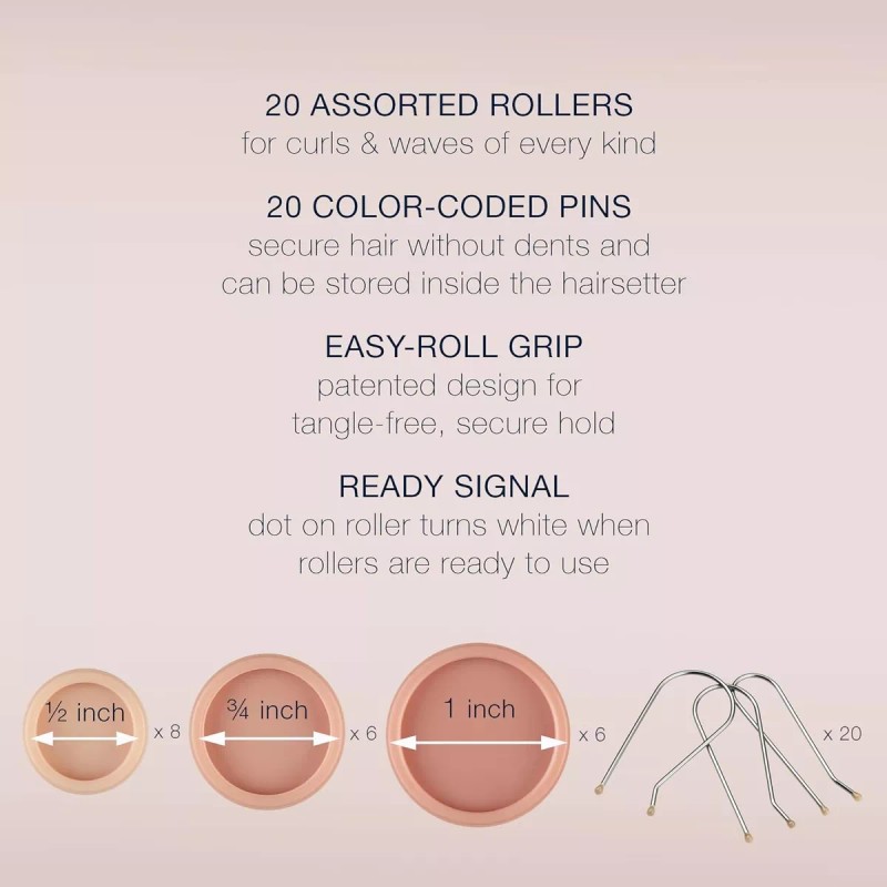 El juego de Hot Roller incluye: veinte rodillos multidimensiones, sin enredos: ocho 1/2 pulgadas (pequeño), seis 3/4 pulgadas (mediano) y seis 1 pulgada (grande) – y – veinte clips de acero inoxidable codificados por colores que se pueden almacenar dentro del corrector de pelo.