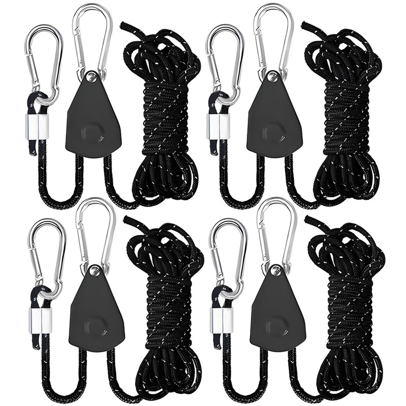 CONBOLA Camping Rope 1/8" Adjustable Rope Hanger Heavy Duty Ratchet Tie Down Strap Tarp Straps Pulley System with Reinforced Metal Gear for Canopy,Kayak and Canoe,Plants Grow Light.(4 Pack)