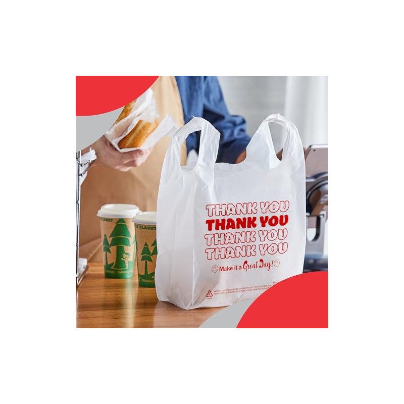 - Our white plastic bags are printed with "Thank You"