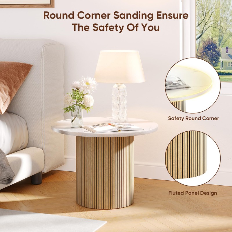 Concho Nesting Coffee Table Oak Set of 2, Marble and Round End Tables for Living Room, Fluted Side Tables with Wood Frame and Brushed Aluminum Edges, Modern Drink Desk for Bedroom, Office