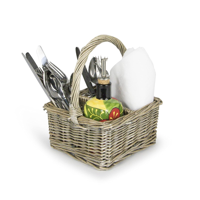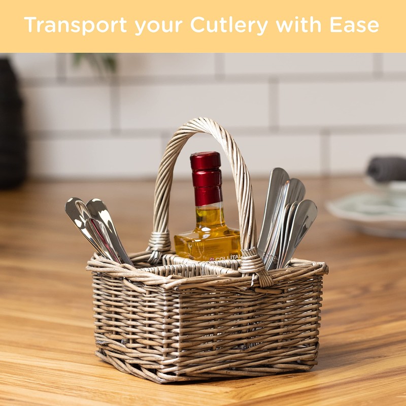 • Luxurious Handcrafted Willow Basket - Made from antiques wash willow in a soft silver/beige colour, with a sturdy carry handle. Split into 4 equal compartments for you knives, spoons, forks and teaspoons.