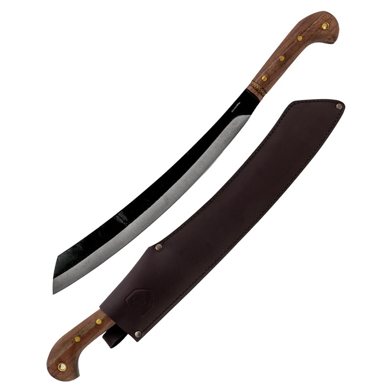 The Duku Machete has a blade thickness of 4.5mm made out of 1075 high carbon steel with a blade length of 15 1/2" and an overall length of 22 1/4". A hardwood handle makes this machete look great. Included with this machete is a hand crafted welted sheath.