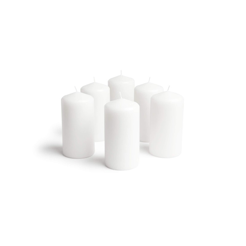 - This bulk set includes 6 pillar candles in white, each measuring 3" diameter x 6" H.