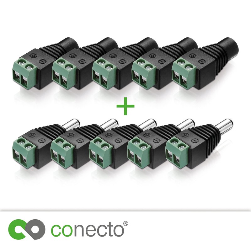 - conecto Niedervolt Adapter (5x Terminalblock 2-polig auf DC-Hohlbuchse und 5x Terminalblock 2-polig auf DC-Hohlstecker), 5,5 x 2,5mm, schwarz