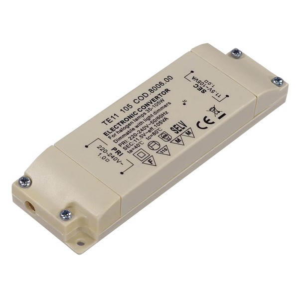 Artikelnummer:EET105LV. Bezeichnung:Elektronischer Halogen-Trafo. Beschreibung:130 x 43 x 20 mm SlimLine, 230V auf 12V, 35-105 W Details:mit berlastungsschutz und Temperatursicherung