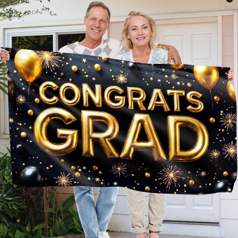 - Specifications: Package includes 1 Congrats Grad banner 5x3ft with 4 brass holes. Does not include rope, brackets, pockets or clips. Perfect piece of décor for your preschool, high school or university party; family gathering or reunion.