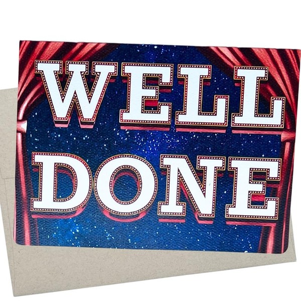 - Colorful and vibrant Well Done card to show appreciation for a job well done whether graduation, sobriety, dance recital, gymnastics competition or other sporting event.